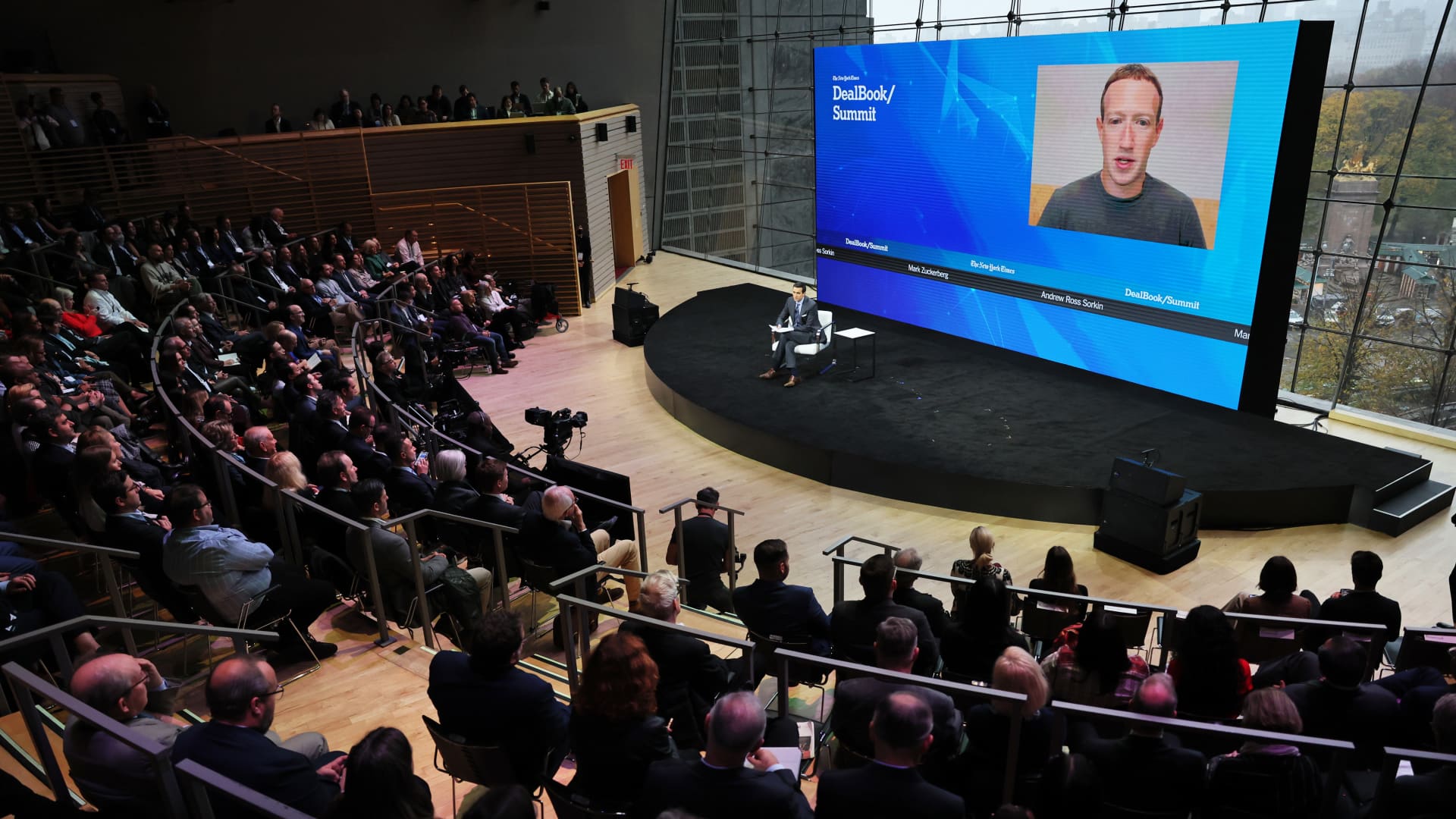 Andrew Ross Sorkin speaks with Meta CEO and founder Mark Zuckerberg during the New York Times DealBook Summit in the Appel Room at the Jazz At Lincoln Center on November 30, 2022 in New York City.