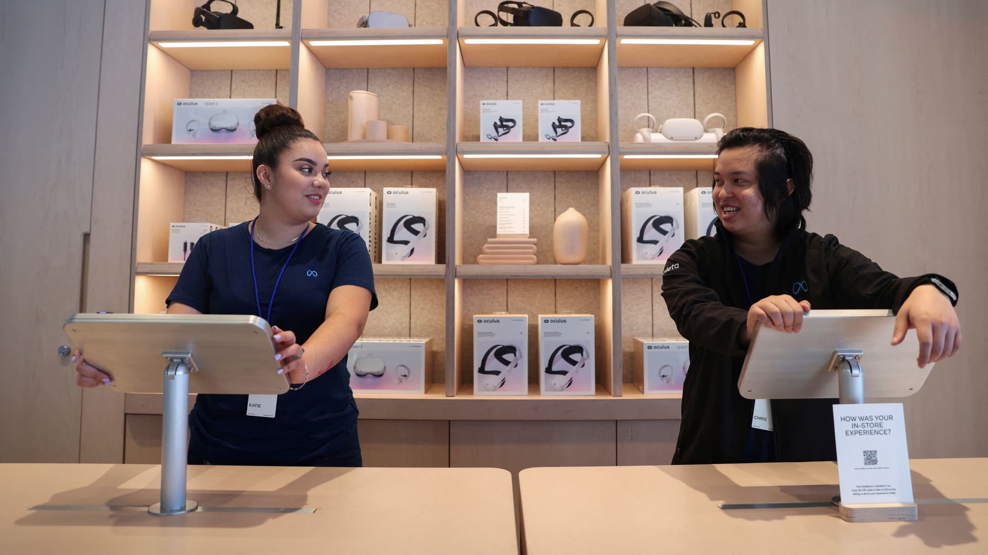 Katie Contreras and Chris Nguyen, experience experts, stand at the Customer Onboarding station for the Quest Demo space during a preview of the inaugural physical store of Facebook-owner Meta Platforms Inc in Burlingame, California, May 4, 2022.