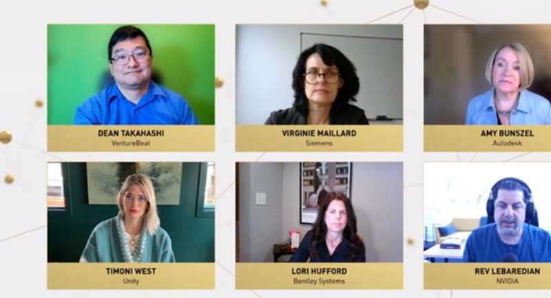The panelists included Rev Lebaredian, head of the Omniverse and simulation technology group at Nvidia; Virginie Maillard, global head of research for simulation and digital twins for Siemens; Amy Bunszel, executive vice president of architecture, engineering, and construction design solutions at Autodesk; Timoni West, vice president of augmented and virtual reality at Unity; and Lori Hufford, vice president of engineering collaboration at Bentley Systems.