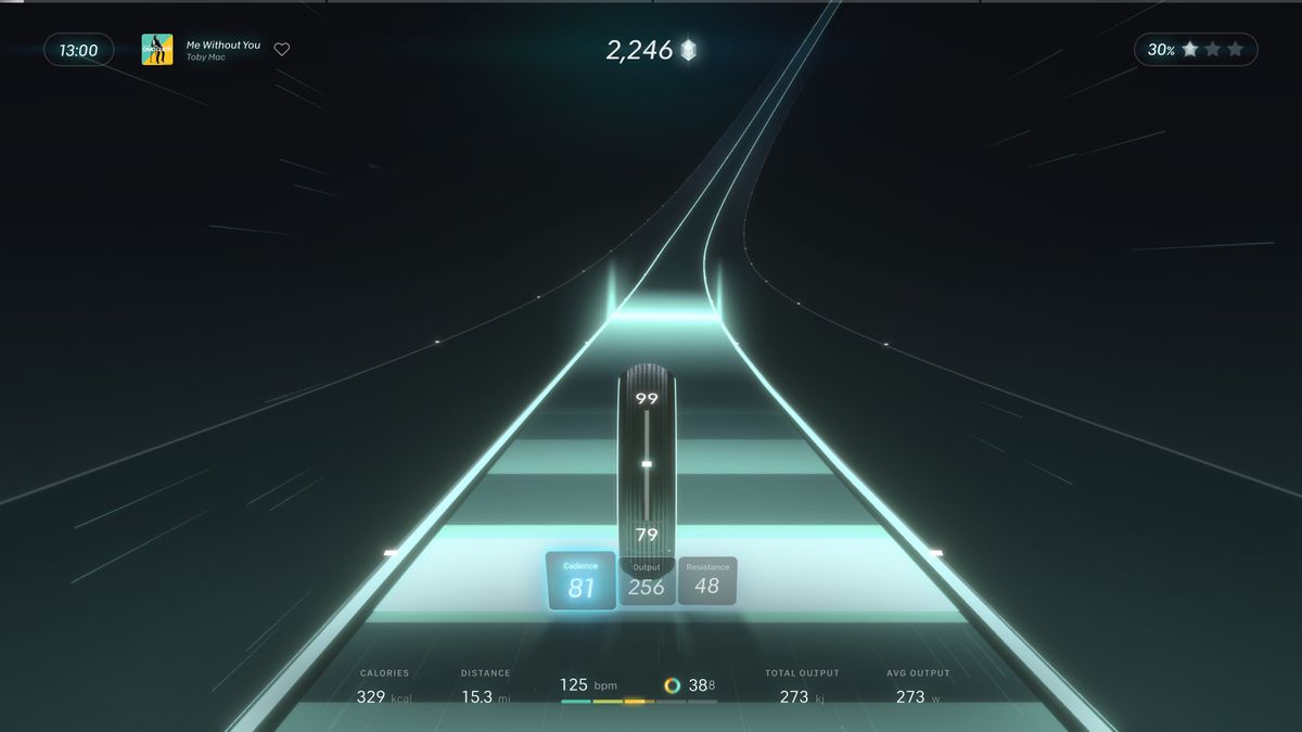 You can find Lanebreak in the “More Rides” menu at the bottom right of a Peloton bike’s tablet. The game itself sort of looks a lot like riding a light cycle in Tron, but it takes elements from rhythm games. Essentially, you can switch between six virtual “lanes” by turning the bike’s resistance knob. The farther right you go, the higher the resistance. There are also game mechanics — dubbed by Peloton as “Moments” — that relate to your resistance and how fast you’re pedaling. For instance, “Beats” are blue bars that give you points for being in a certain lane. “Breakers” are orange sections where you’re supposed to pedal faster, while “Streams” are green sections where you stay within a specific cadence range.