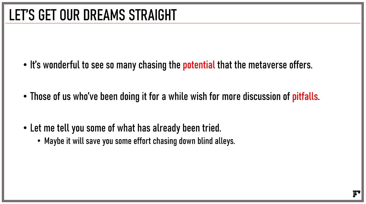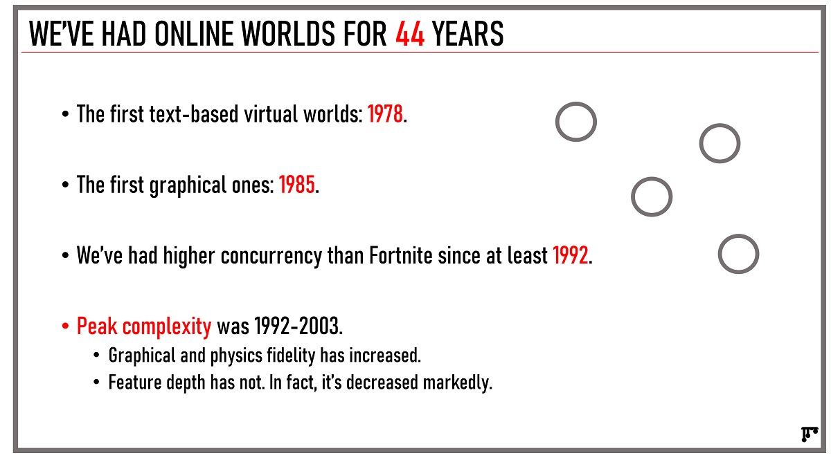“I’m here to just share some high level lessons, some mistakes that have already been made, in hopes that it saves you from making future mistakes,” he said. “We’ve had online worlds for 44 years, and any vision of the metaverse is built on top of the idea of online worlds, whether you call them online worlds, MUDs (multi-user dungeons), virtual worlds social worlds — it doesn’t matter.”