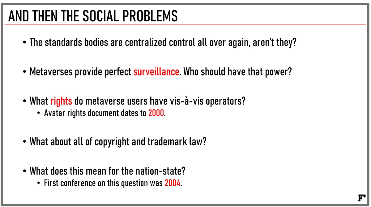 He said the industry has been wrestling with the challenges of governance ever since the infamous rape in cyberspace case around 1993. The technical infrastructure to enable this implies the ideal architecture is quite different from how things work today, even if we solve the substantial problem of having all the different clients able to use same 3D asset format, he said.