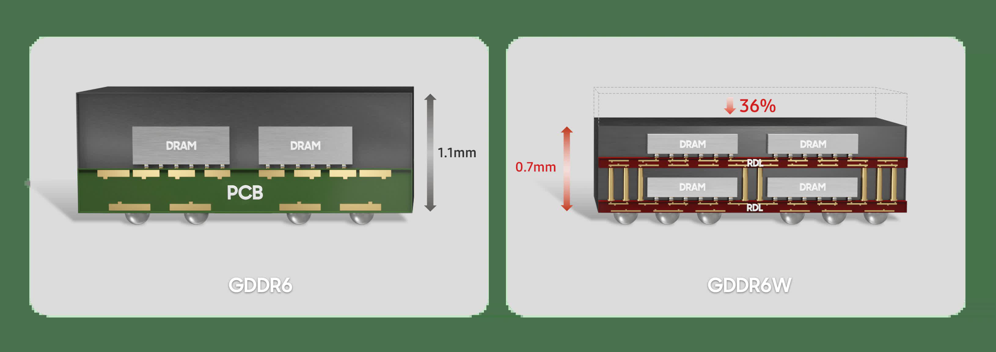 These changes to module placement and overall die size result in GDDR6W being 36% shorter than its GDDR6 counterpart. Due to the unchanged footprint, these modules could be “put into the same production processes” used in current GDDR6 products.