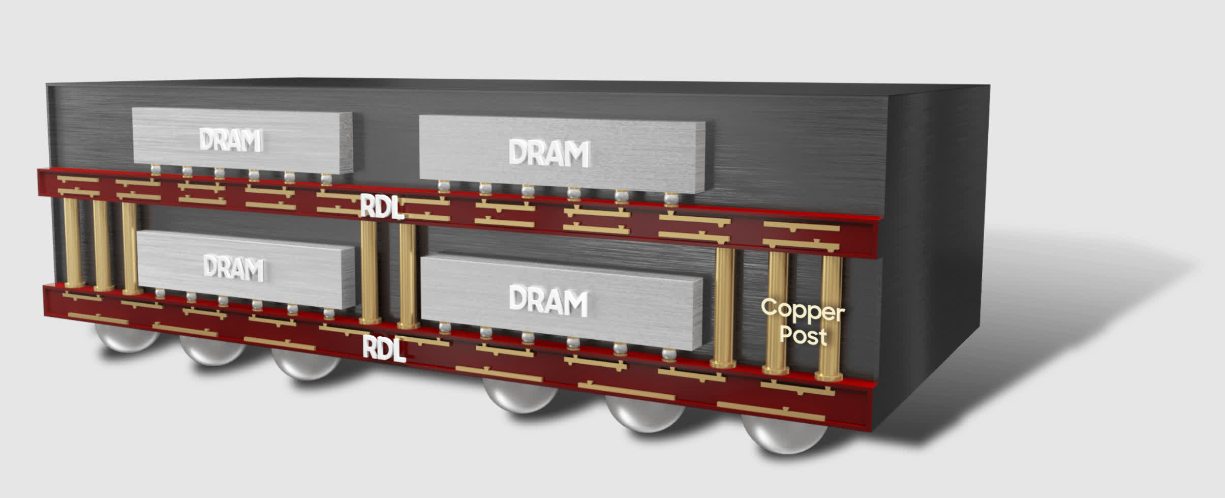 Samsung started by taking its existing GDDR6 platform and implementing what it calls “Fan-Out-Wafer-Level Packaging” (FOWLP). Rather than placing the memory dies on a PCB, they are mounted directly onto a silicon wafer. Redistribution layers allow for “finer wiring patterns,” and since no PCB is involved, the modules will be thinner overall and have better heat dispersion.