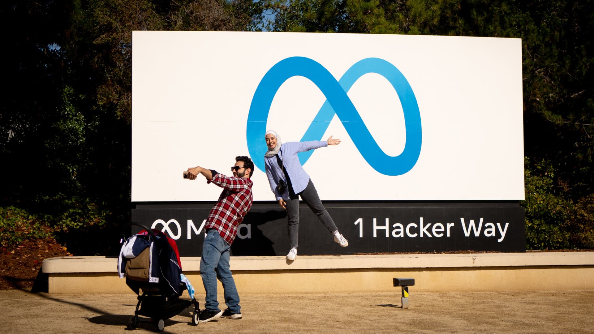 Anwar Almojarkesh (L) and Alan Chalabi (R) from England take a photo at Meta (formerly Facebook) corporate headquarters in Menlo Park, California on November 9, 2022.