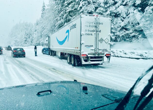 Logistics are fun! An Amazon Prime delivery truck deals with snowy conditions on Interstate-90, east of Seattle. The e-commerce giant, which shipped an estimated 7.7 billion packages globally in 2021, said near the end of 2022 that it was preparing for a slower growth period due to increased foreign currency headwinds, global inflation, fuel prices, and rising energy costs.