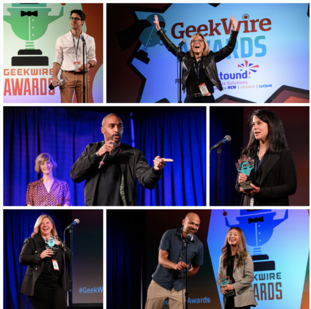 The tech community gathered for the GeekWire Awards in person for the first time in three years in May. From top left, clockwise: Varun Puri of Yoodli; Sen. Sharon Brown; Saema Somalya of Remitly; Viraj Mody and Linda Lian of Common Room; Vija Williams of Place; and former Seahawks star Doug Baldwin. Read more.