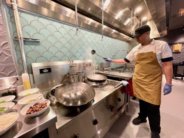 Microsoft chef Jevic Acain works on an electric wok at Pacific Rim, a culinary concept at the new One Esterra Food Hall at the company’s headquarters in Redmond, Wash. The 100% electric food hall is a first for Microsoft and a proving ground for what’s to come across the company as the tech giant aims to be carbon negative by 2030. Read more.