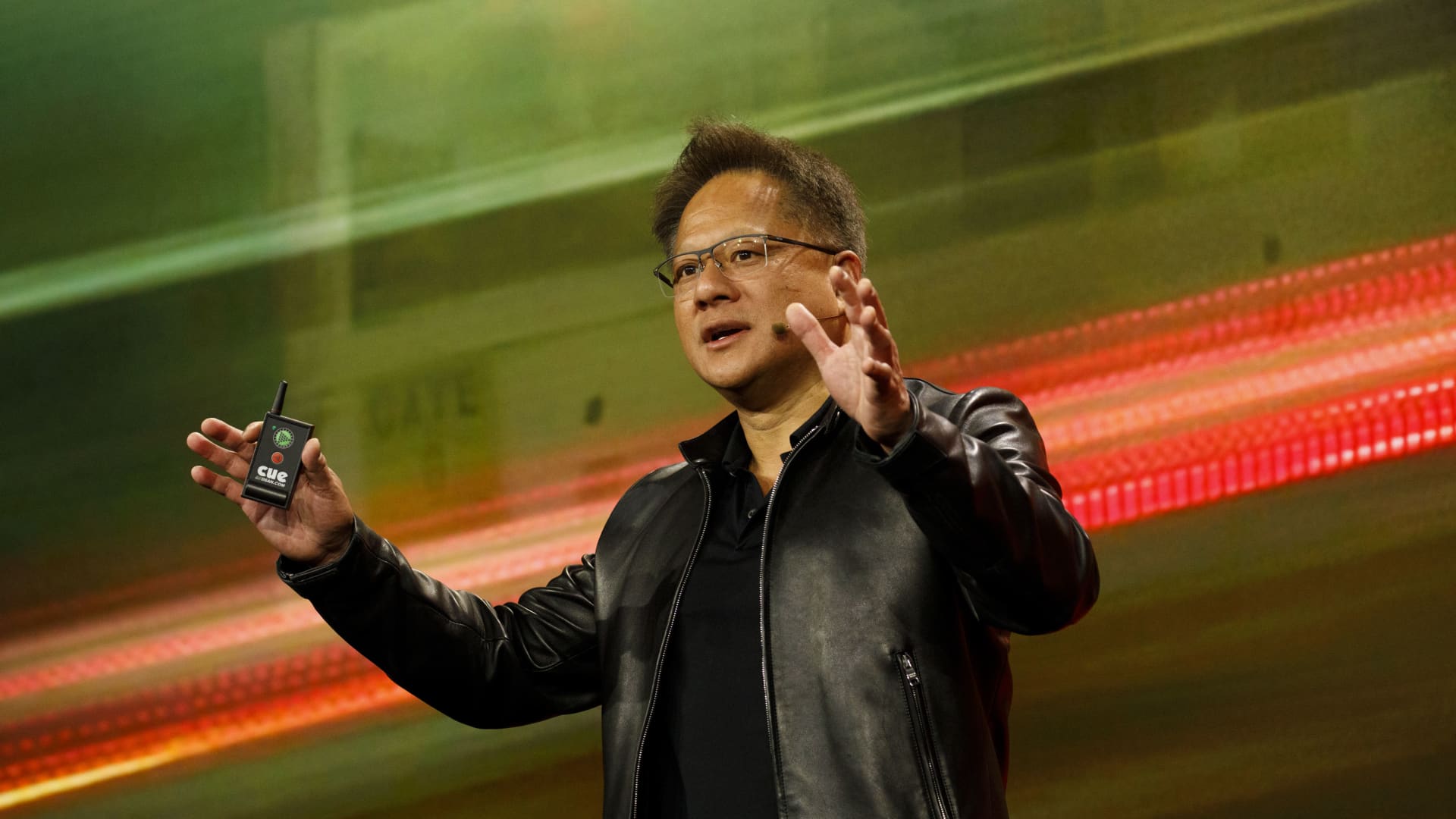 Jen-Hsun Huang, president and chief executive officer of Nvidia Corp., speaks during the company’s event at Mobile World Congress Americas in Los Angeles, California, U.S., on Monday, Oct. 21, 2019.