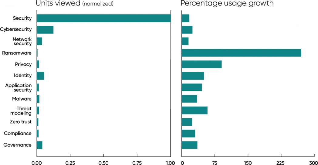 Usage of general content also increased. Units viewed for items with the word “security” or “cybersecurity” in the title increased by 17% and 24%, respectively. Network security, also a general topic, increased 15%. While these increases are relatively modest compared to specific topics like ransomware and privacy, keep in mind that in absolute numbers, the usage of “security” titles led all other security topics by a large margin. And a 17% increase in an established topic is very healthy.