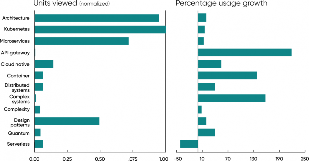 Software architecture, Kubernetes, and microservices were the three topics with the greatest usage for 2021. Their year-over-year growth is also very healthy (19%, 15%, and 13%, respectively). It only looks small when compared with the growth of topics like API gateway (218%). That kind of growth reflects the “law” we’ve observed throughout this report: it’s easy for a small topic to have large growth numbers but much more difficult for a topic that’s already dominant. API gateway content gets roughly 1/250 as many units viewed as content on architecture or Kubernetes does.