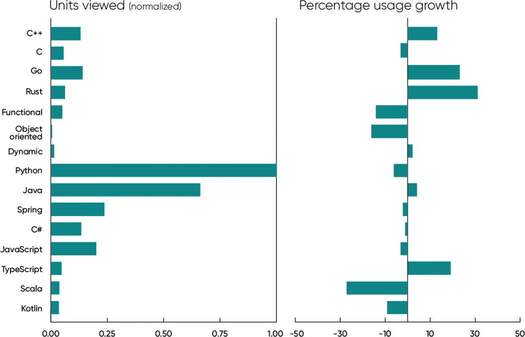 Having said all that, what about the “old guard”? They’re nice and stable. Python, Java, and JavaScript are still the leaders, with Java up 4%, Python down 6%, and JavaScript down 3%. (“Python” and “Java” are both in the top five words used in O’Reilly Answers.) Although any change under 10% is small in the greater scheme of things, we’re surprised to see Python down. And, like last year, usage of Java content is only slightly behind that of Python if you add Spring usage to Java usage. (Spring is a large, all-encompassing group of frameworks in the Java ecosystem, but Spring titles usually don’t mention Java.) C#, a core language on Microsoft platforms, was also stable (down 1% year-over-year).