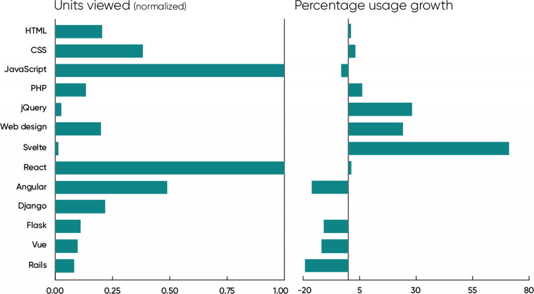 In the Pythonic corner of the web development space, Django is holding steady: the number of units viewed is healthy (and greater than Flask, Svelte, or Vue), and we saw no change year-over-year. Usage of content about Python’s Flask framework is headed downward (12% decline). Likewise, the most widely known Ruby framework, Rails, is down 19%.