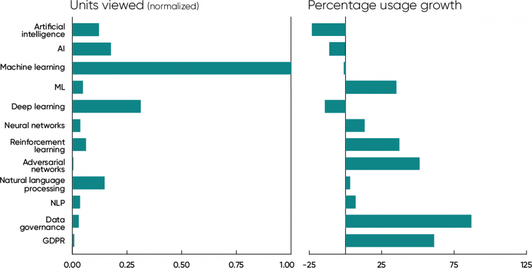 It’s also worth looking at the significant increase in the use of content about data governance (up 87%) and GDPR (up 61%). Everyone working with data should know that data governance and its related topics (data provenance, data integrity, auditing, explainability, and many other specialties) aren’t optional. Regulation of the use of data isn’t some vague thing off in the future. It’s here now: GDPR (the EU’s General Data Protection Regulation) is in effect, as is California’s Consumer Privacy Act (CCPA). Now is the time to start thinking about data governance—not later, when it will certainly be too late. Data governance is here to stay, and our platform shows that data professionals are learning about it.