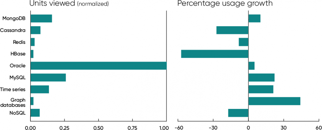It’s worth looking at alternatives to Oracle though. We’ve heard about the death of NoSQL, and certainly usage of content about NoSQL is down (17%). But that isn’t a good metric. NoSQL was never a single technology; databases like Cassandra, HBase, Redis, MongoDB, and many others are wildly different. NoSQL is really more a movement than a technology—one that’s devoted to expanding the number of storage options for system designers. A good understanding of NoSQL means realizing that for most applications, relational databases are a good fit.