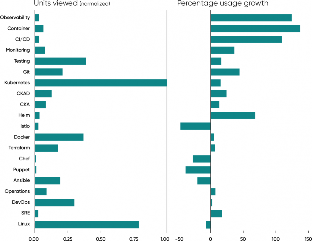 Finally, look at the units viewed for Linux: it’s second only to Kubernetes. While down very slightly in 2021, we don’t believe that’s significant. Linux has long been the most widely used server operating system, and it’s not ceding that top spot soon. If anything, its importance has increased: Linux is the standard operating system for the cloud. Even on Azure, Linux dominates. Solid knowledge of Linux is essential for anyone working in operations today.