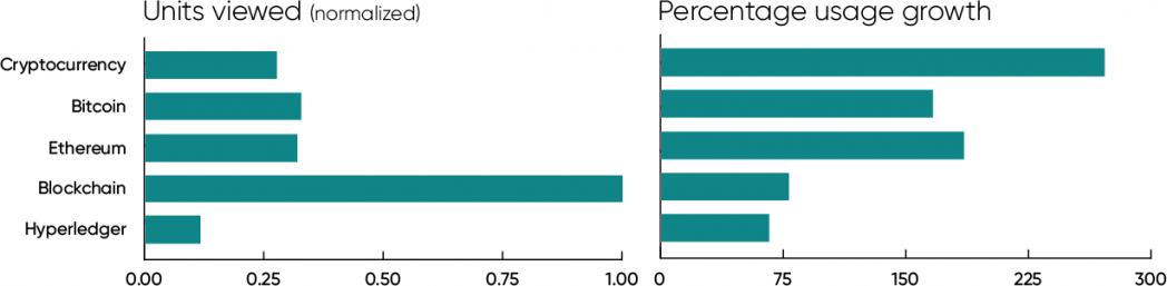 Whether it’s the future of finance or history’s biggest Ponzi scheme, use of content about cryptocurrency is up 271%, with content about the cryptocurrencies Bitcoin and Ethereum (ether) up 166% and 185% respectively. General content about blockchains is up 78%, and from a much higher starting point (reflecting the fact that our audience has more developers than speculators). Hyperledger, a collection of blockchain technologies that targets enterprise markets, is up 66%. Our data doesn’t tell you whether to buy bitcoin or ether, but it does show a huge increase in interest.