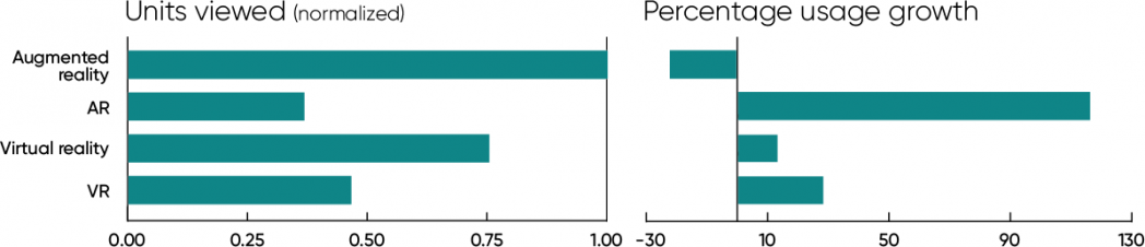 Has all this ferment shown up in our platform data? Keep in mind that we’re only using data through September (in both 2020 and 2021). The results are ambiguous. Use of titles containing the phrase “augmented reality” is down (22%), and those are the most heavily used titles in this group. But virtual reality, VR, and AR are all up (13%, 28%, and 116%, respectively), yielding a 24% gain across the entire group.