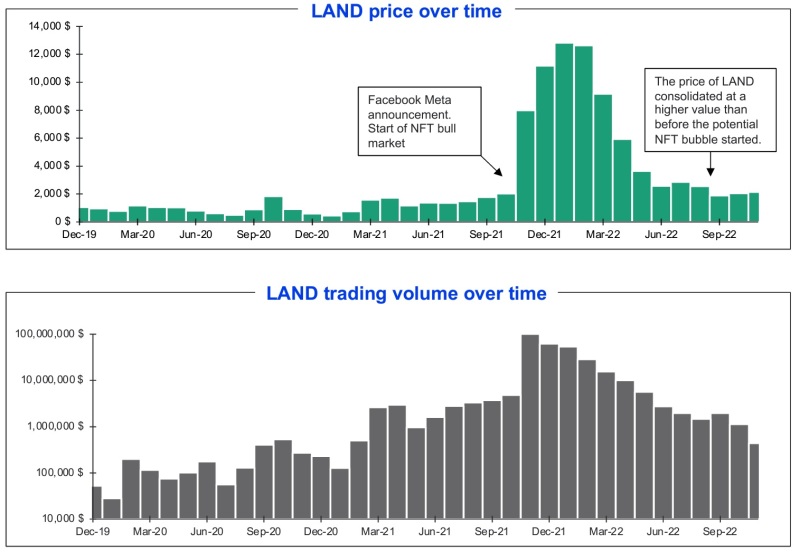 The research, which focused on all LAND sales prior to November 9, showed that the price of LAND has consolidated. During the peak of metaverse hype after Facebook changed its name to Meta in October 2021, the price of LAND skyrocketed.