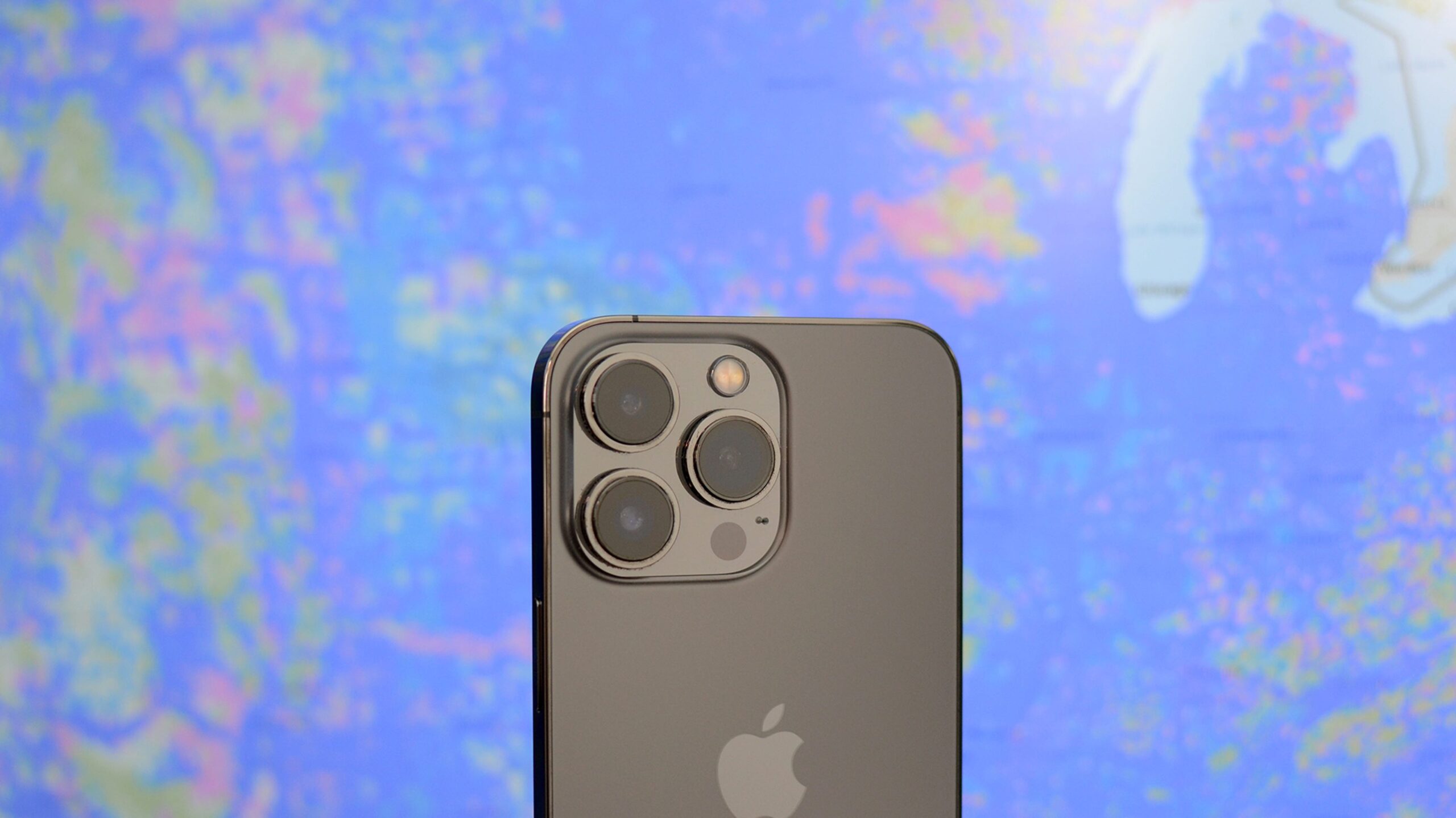 A smartphone held in front of a cellular rollout map.