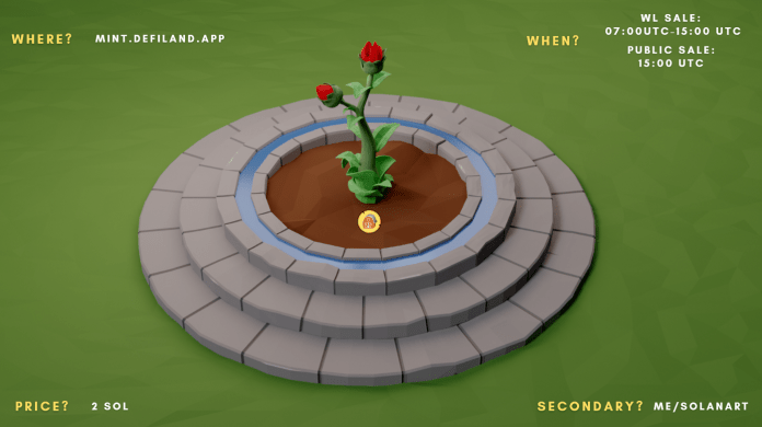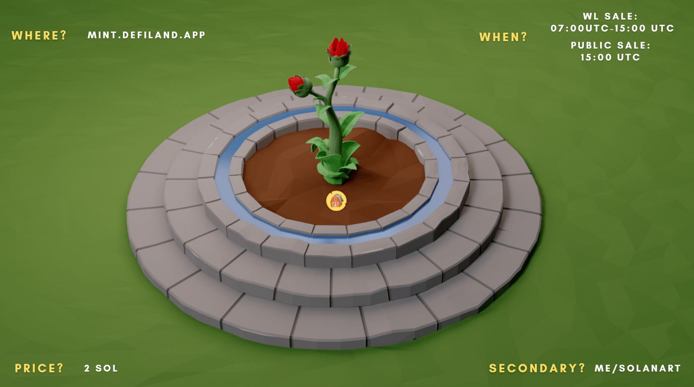 Cost of the mint: 2 SOL per seed. You then have the option to water your seed in-game with 50 to150 DFL per day for 30 days to maximize the quantity and probability of rarity of NFTs received.