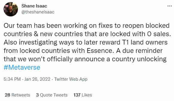 We would like to remind that since these countries were locked post the initial purchases and no new land was bought in these places, the tile price remained stagnant. The EDC was based on New Land Value (NLV), and therefore users who had land in such countries lost out on potentially higher Essence. Finally, it seems they are bound to get some compensation, and their patience has been rewarded.