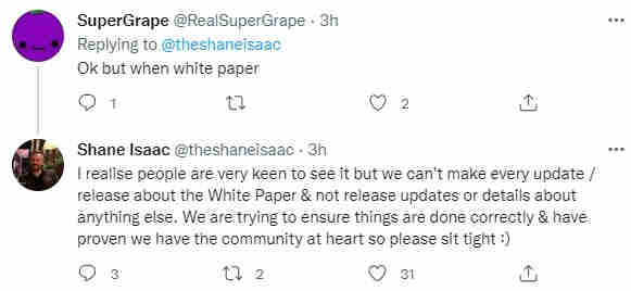 Shane had mentioned in an earlier community chat on Dec 16, that the Whitepaper will be released in early 2022 (potentially over the next month as he mentioned Jan/Feb). When asked about it again today, he asked users to be patient and it will be done ‘correctly’.